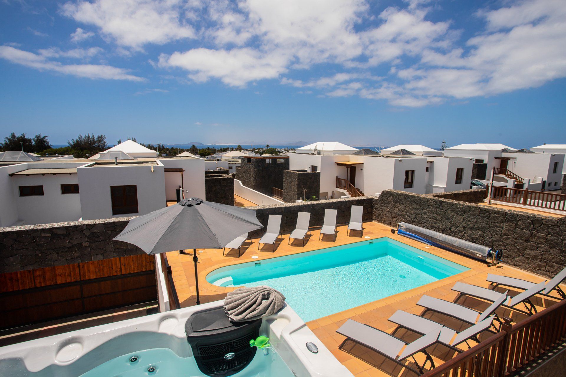 This fabulous villa in Playa Blanca is located in the 5 * Residential Complex, as is Residencial Vista Lobos. Situated in an elevated position, the villa offers panoramic views of the sea, the Isla de Los Lobos and the Isla de Fuerteventura. The impressive villa is within walking distance of the town center and the beaches, thus offering a true range of luxury accommodation without the need for a car.